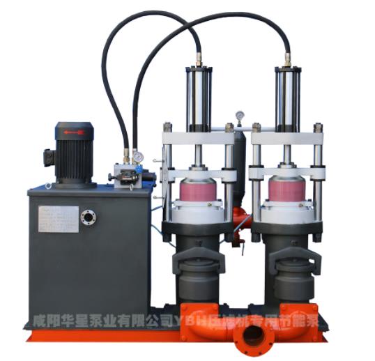 泵開始給壓濾機(jī)進(jìn)料和低壓過濾時(shí)保持大流量不變,隨壓濾機(jī)空腔充滿物料壓力升高,壓濾機(jī)過濾能力開始變小,達(dá)到設(shè)定值時(shí)液壓系統(tǒng)控制YBH泵的運(yùn)行速度降低、輸出流量變小。壓濾機(jī)過濾能逐漸降低,進(jìn)料壓力逐漸升高,泵的進(jìn)料流量自動(dòng)變小,小流量為額定流量的20%,泵輸出流量壓力曲線與壓濾機(jī)佳過濾曲線基本吻合。全過程因此高效節(jié)能,比普通泵節(jié)能60%以上。
